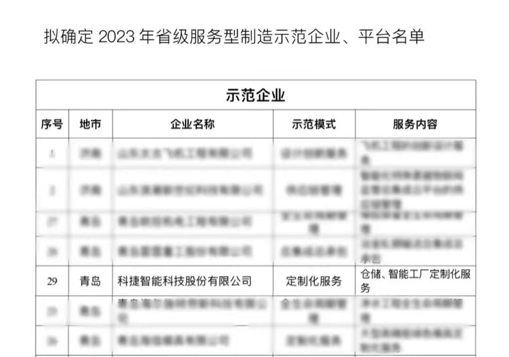 近日,山東省工業和信息化廳公示了2023年省級服務型制造示范企業、平臺名單,科捷智能成功入選2023年省級服務型制造示范企業,再獲省級榮譽認定。